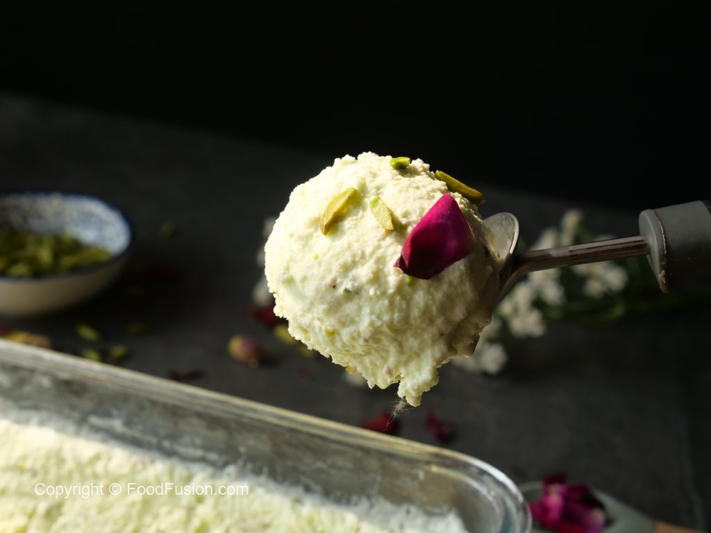 Once frozen completely,scoop out,decorate with pistachios & serve!