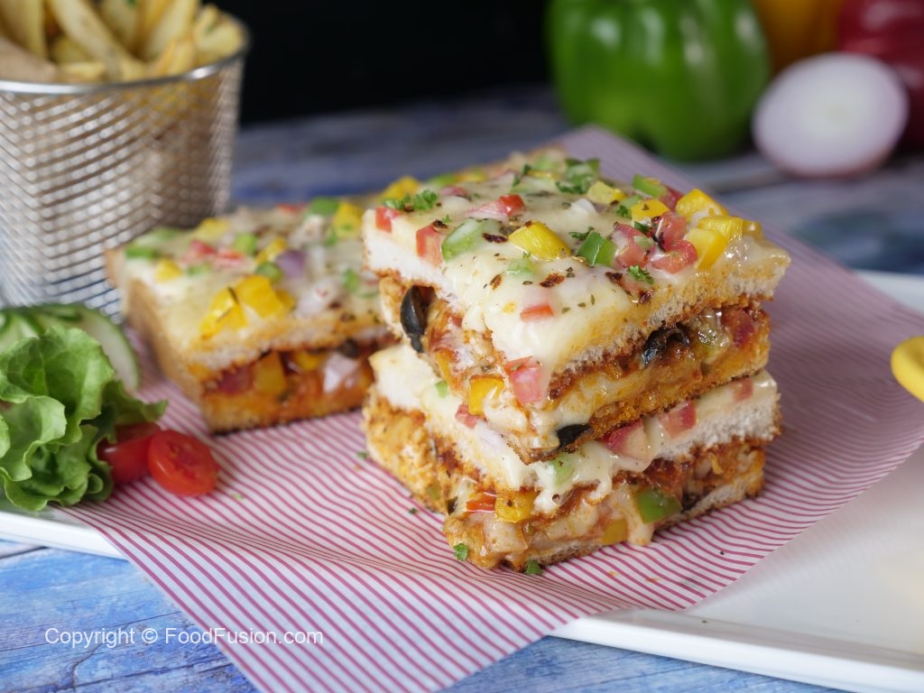 A quick and Easy Pizza sandwich without oven. This is a perfect quick snack recipe for your family. #HappyCookingToYou #FoodFusion