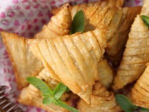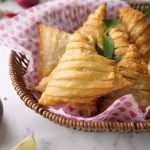 -Apply flour slurry,make a pocket,add mince filling in the centre & roll into the shape of samosa and seal corners with all-purpose flour slurry (makes 12-14).