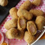 -Now coat croquettes with all-purpose flour then dip into whisked eggs & coat with breadcrumbs (makes 22-24).