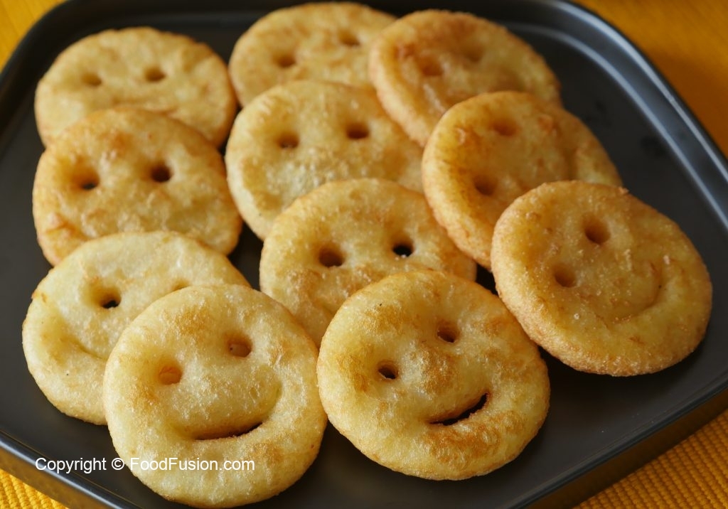 In wok,add corn oil,heat it and fry potato smileys on medium flame until golden brown.