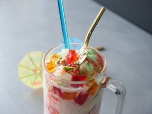 In serving glass,add falooda sev,basil seeds,lal sharbat,prepared rabri milk,yellow jelly,red jelly,pistachio ice cream scoop,falooda sev,basil seeds,pineapple chunks,red jelly,yellow jelly,lal sharbat,almonds, pistachios & serve!