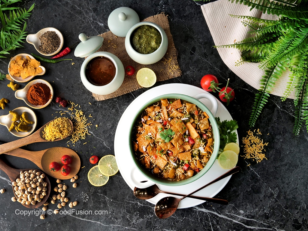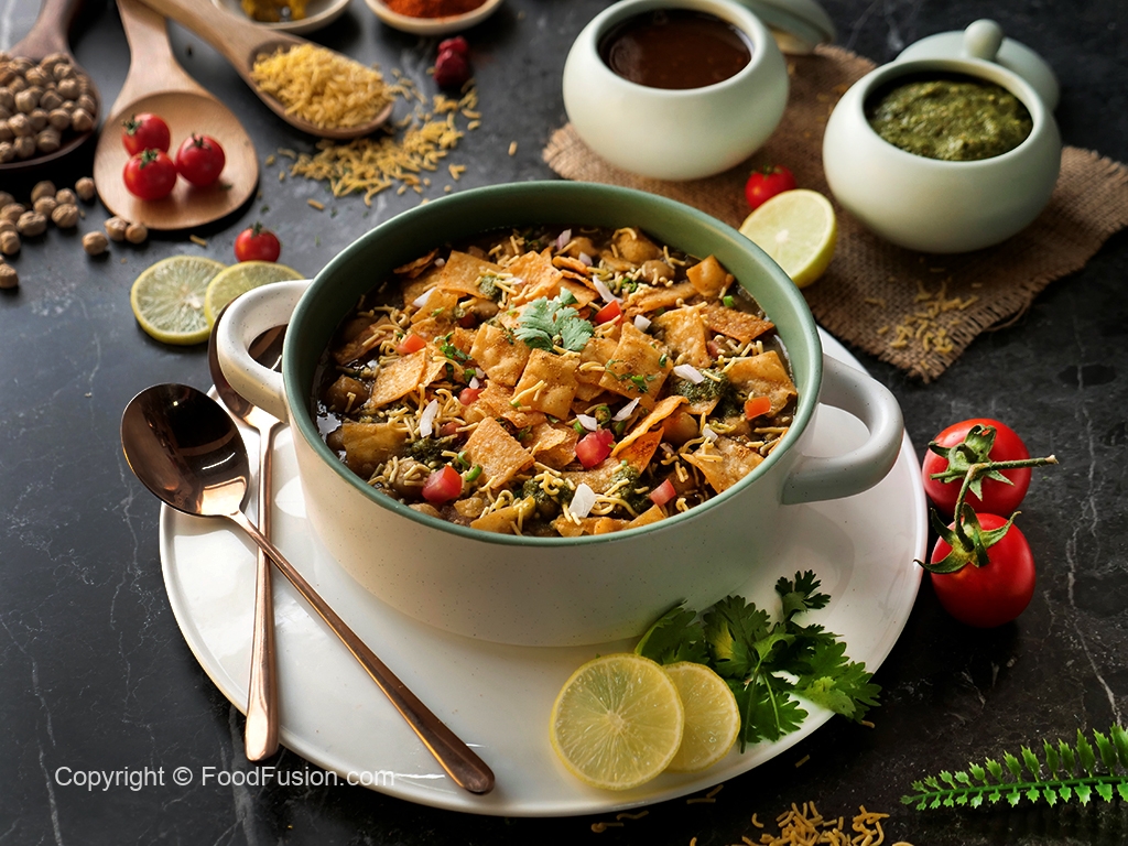 Serving dish mein radga chaat,pyaz,tamatar,hari mirch,spicy green chutney,tamarind sauce,sev nimco,papri,hara dhania aur chaat masala dal ker serve karein!