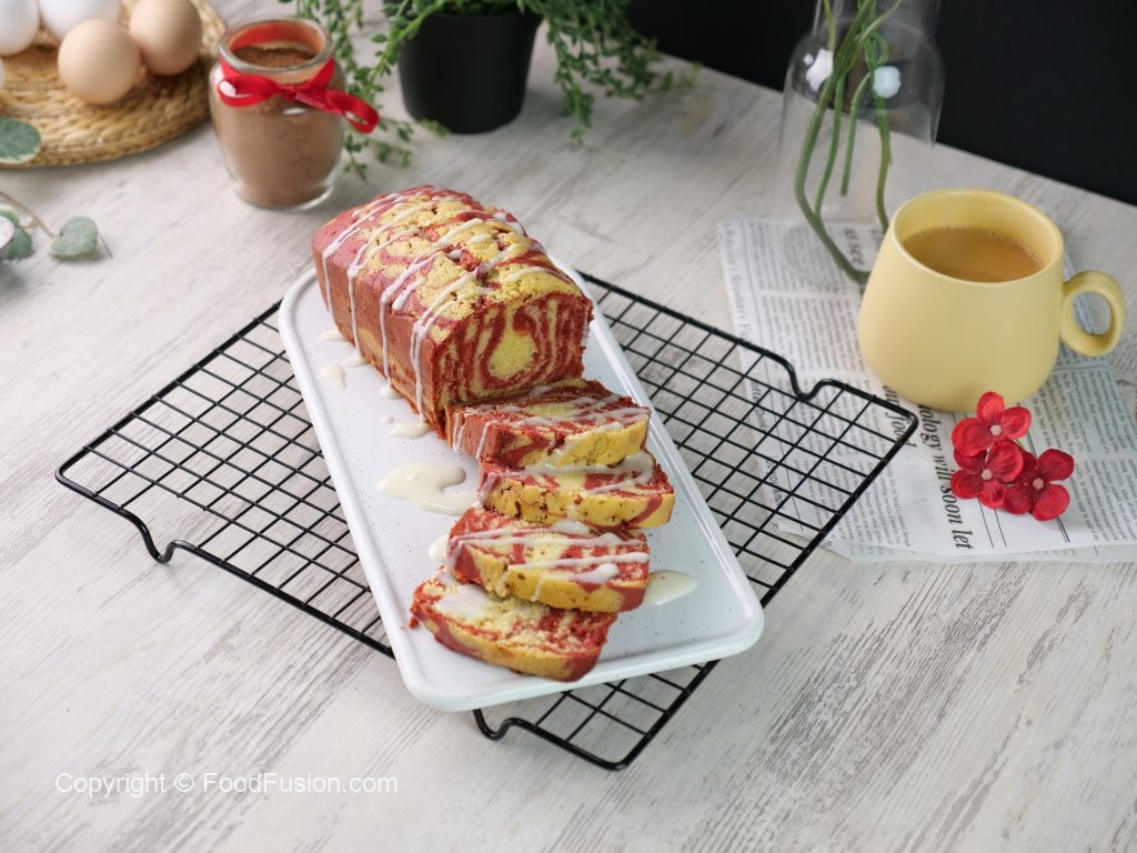 -Dono batter ko loaf pan mein alternatively pipe out kertay jayein aur few times tap karein phir skewer ki madad sa swirls bana lein.