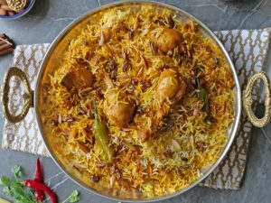 Now add dissolved food color and fried onion,cover and steam cook on low flame for 18-20 minutes.
