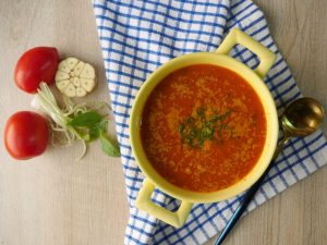-In a chopper,add tomatoes,onion,garlic,green chilli,fresh coriander,cumin powder,pink salt,black pepper crushed,lemon juice,olive oil,chop coarsely & set aside.