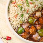 -Serve spicy Schezwan chicken gravy with fried rice!
