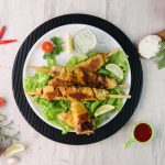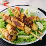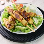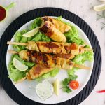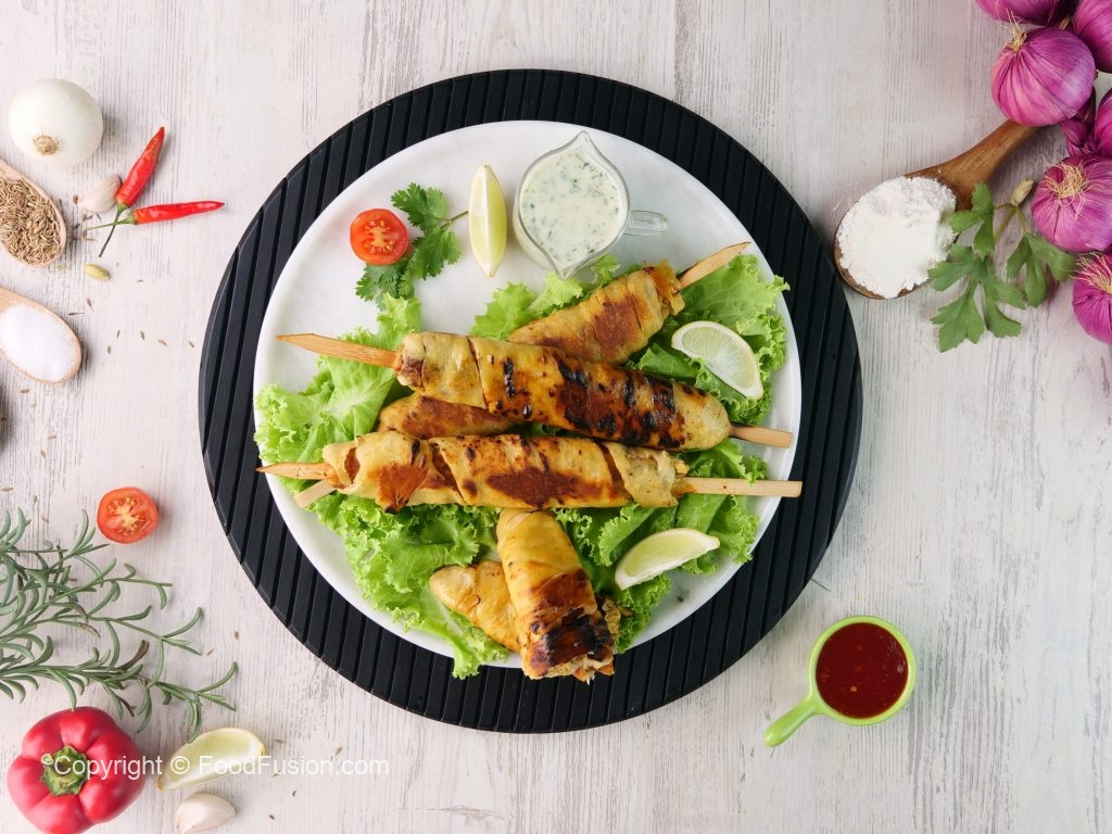 -Heat griddle & cook wrapped skewers on low flame from all sides until golden then fire roast on direct flame until its charred from all sides.