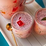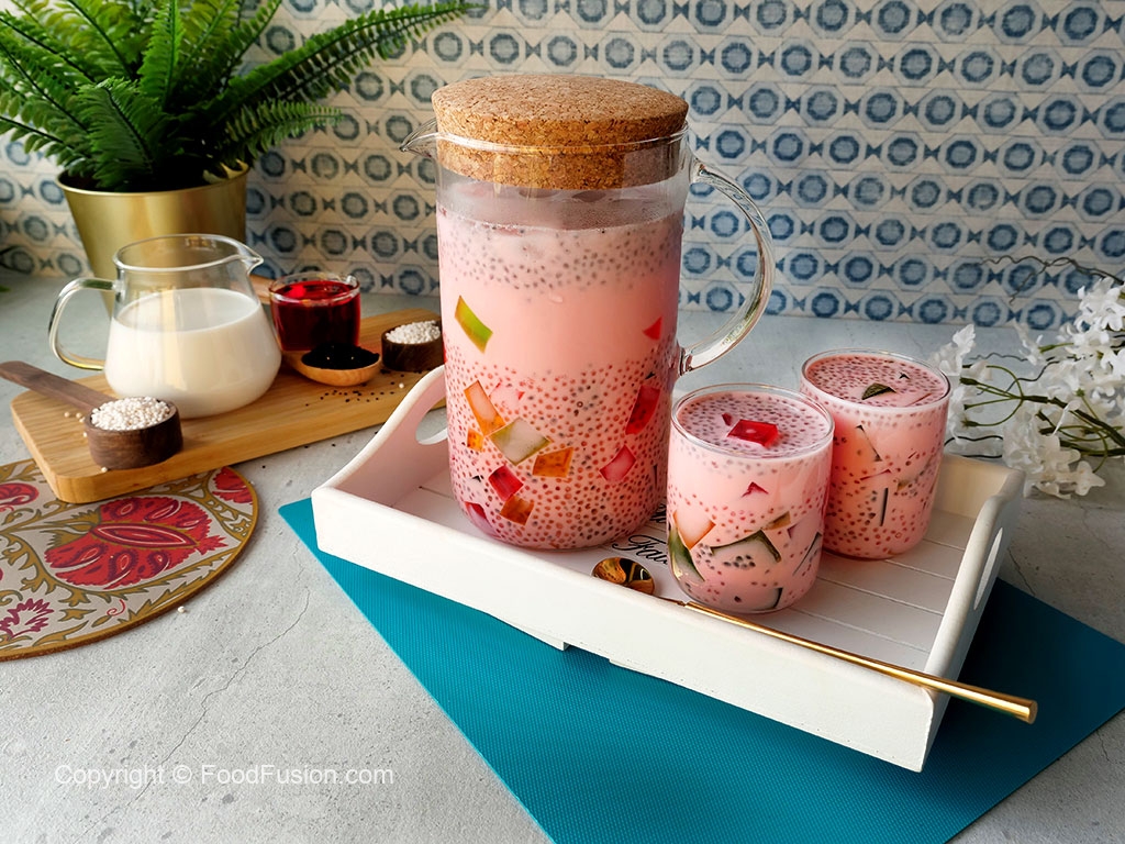 In a jug,add ice cubes,coloured jelly cubes,cooked tapioca sago,soaked basil seeds & prepared milk,mix well & serve!