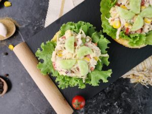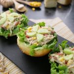 -On each air fried/toasted burger bun,place lettuce leaf,prepared chicken salad & garnish with cucumber & serve! (Serves 6-8)