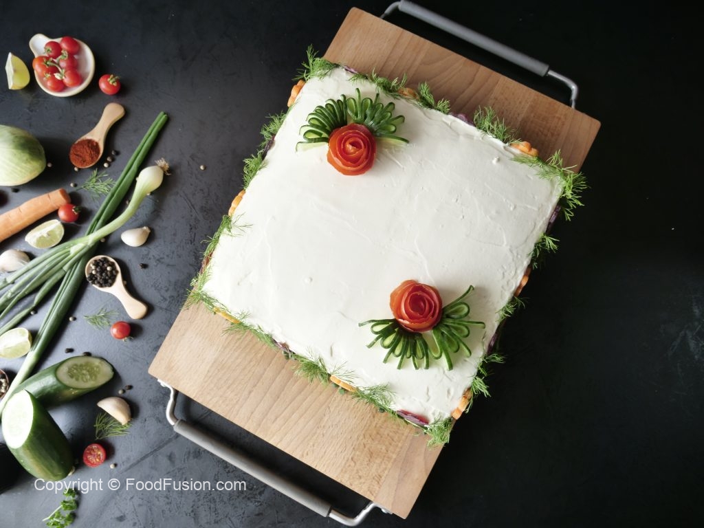 Decorate sides & top with green onion leaves,dill,cucumber,carrot,beetroot & tomato.