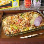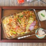 Spread dissolved red food color,green food color,orange food color & yellow food color,mint leaves, fresh coriander,fried onion,cover & steam cook on low flame for 18-20 minutes.