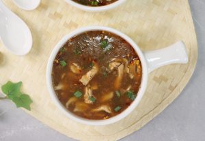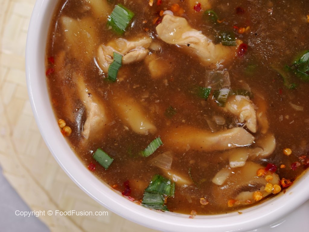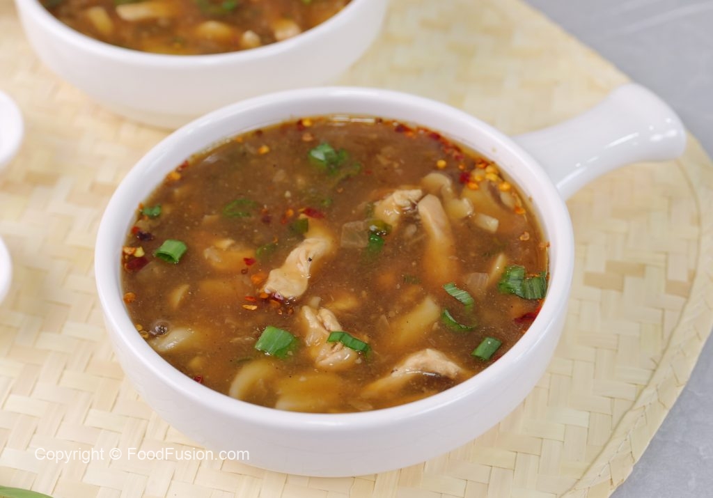 -In serving bowl,add red chilli crushed,soy sauce,sesame oil,soup,green onion leaves & serve!