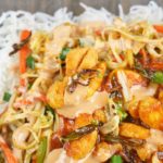 In the same pan, add oil and all vegetables except green onion’s green. Add soya sauce, salt, black pepper, red chili and stir fry for 1-2 mins. Add boiled egg noodles and toss. Add sesame oil and green onions’ green. Toss well and dish out in a bowl and set aside.