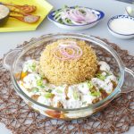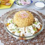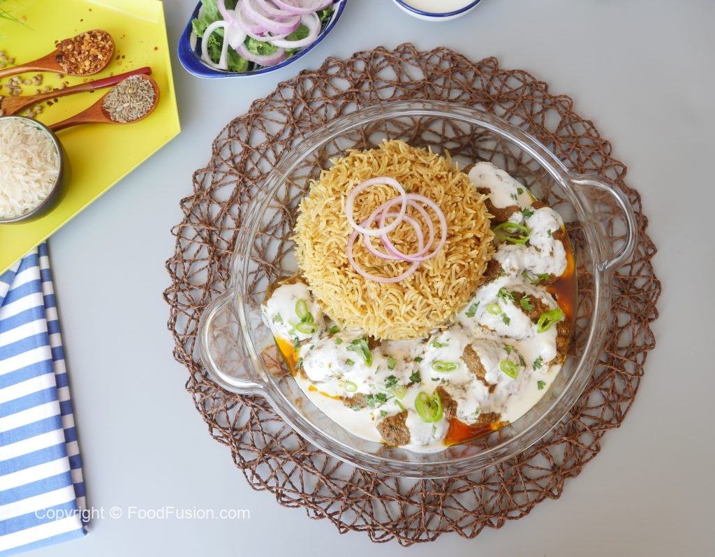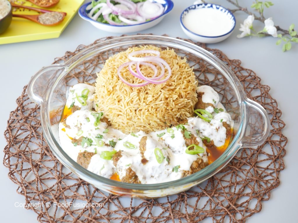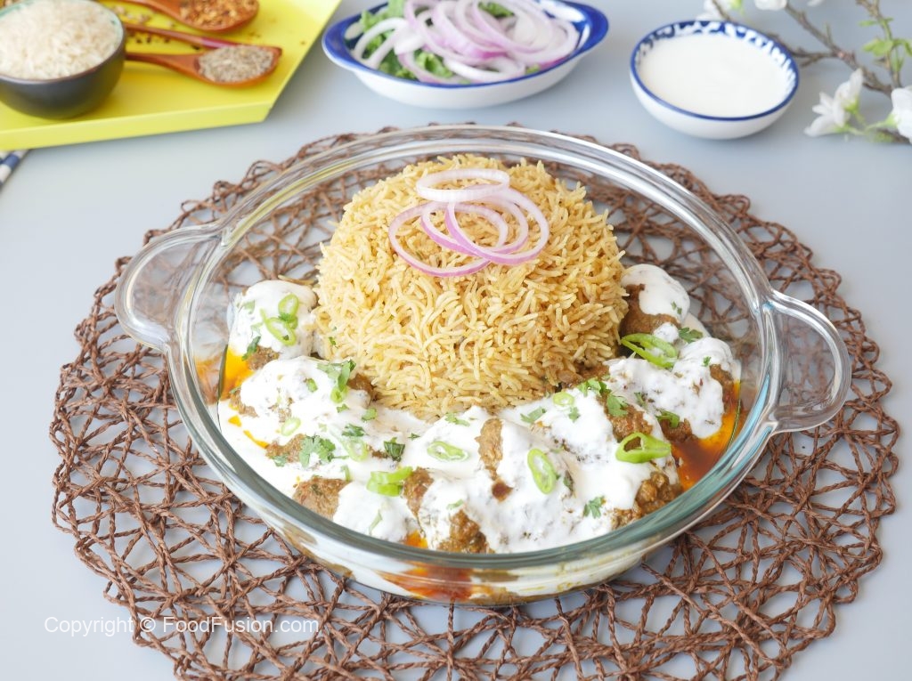 On serving dish,add prepared pulao,kabab with gravy and yogurt.