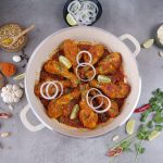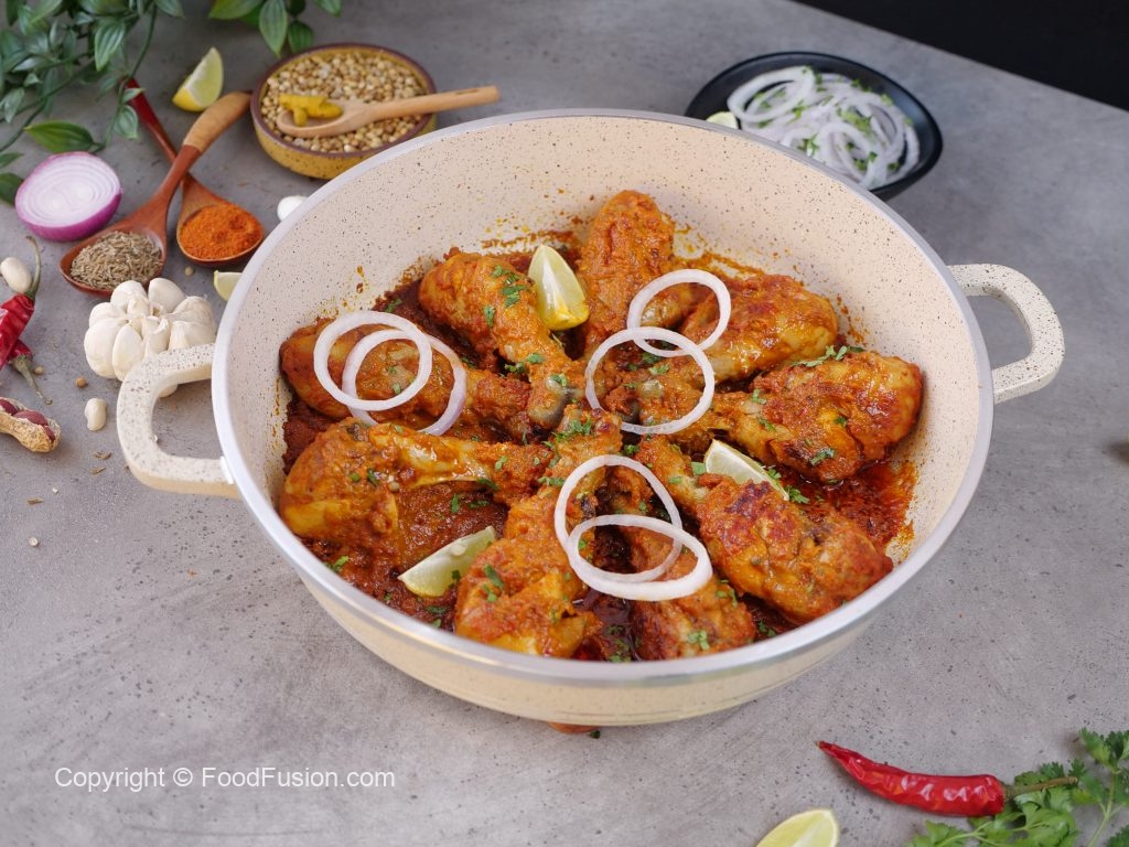-Karahi mein cooking oil aur marinated drumsticks dal ker remaining marinade laga lein aur dhak ker halki ancch per 12-15 minutes kliya paka lein aur bech bech mein sides ko tturm ker lein aur remaining marinade laga lein ker dhak dein aur halki ancch per gul janay tak paka lein (12-15 minutes).