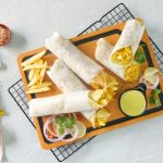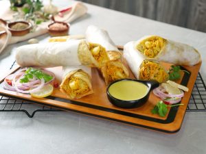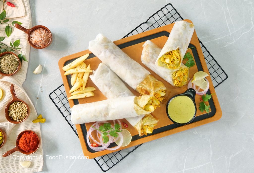 -On a paratha,add & spread prepared sauce,add chicken filling,french fries,prepared sauce & roll it.