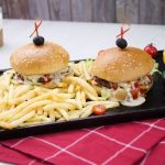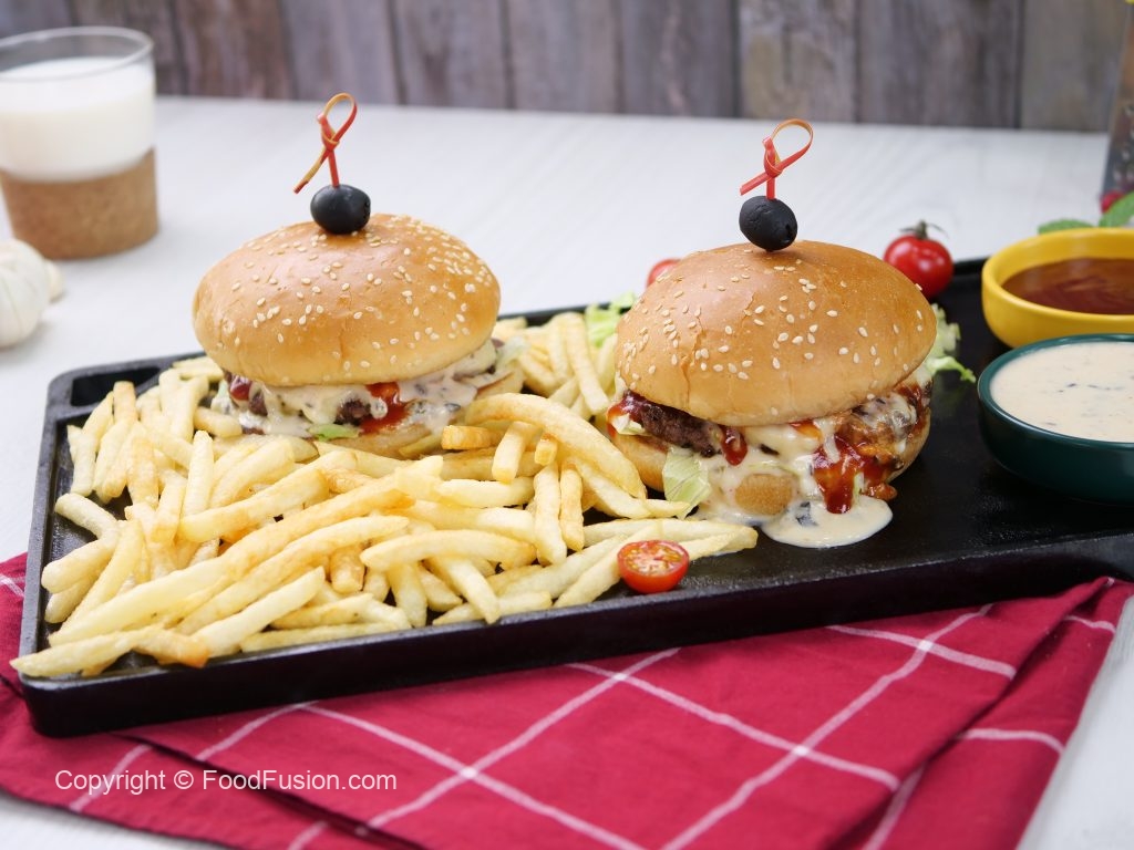 -Toasted burger bun per tayyar cheese sauce,iceberg,cooked beef patty with cheese,cheese sauce aur tomato ketchup dal ker upper sa burger bun rakh dein (makes 5).