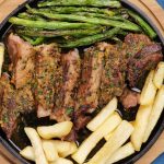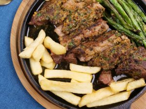 -Add seasoned steak piece,press with patty press to lock the juices,flip,repeat the process & cook on medium flame from both sides until done,rest it for 2 minutes then cut into pieces.