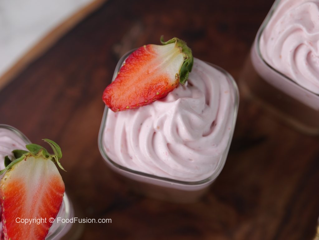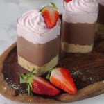 -Serving glass mein crushed biscuits,tayyar chocolate pudding & strawberry cream dal dein.