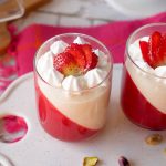In serving glass,add prepared pistachio kheer enough to cover strawberry jelly and garnish with whipped cream & strawberry slices.