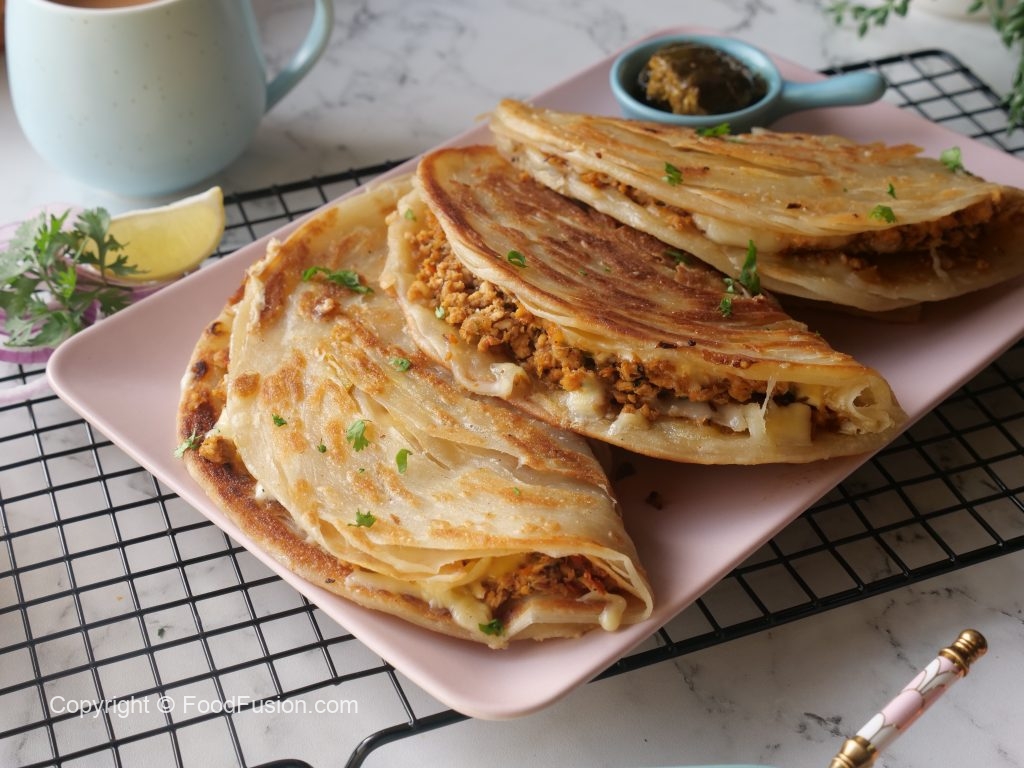 -Spread prepared chicken filling on one side, add mozzarella cheese & flip the other side of paratha over it. Press gently & cook from both sides until golden & crispy (makes 10).