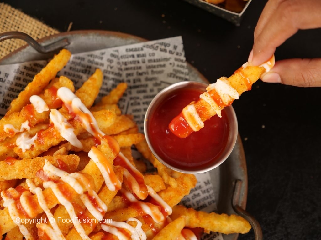 -Drizzle mayonnaise,tomato ketchup,fries masala & serve!