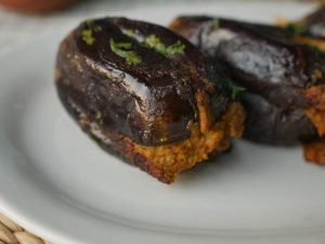 Baigan mein char slit laga lein aur tayyar mixture sa bhar dein.