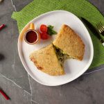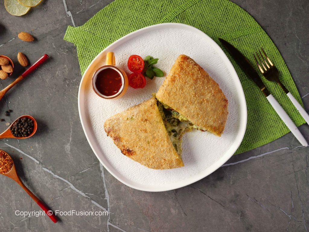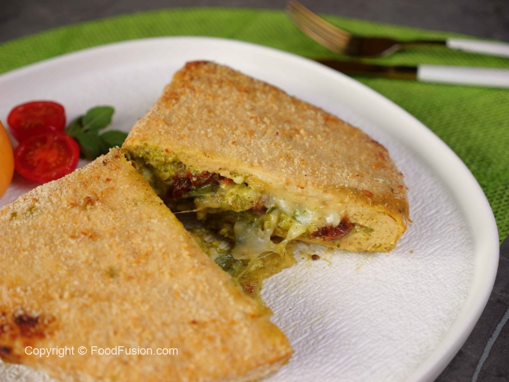 -Add prepared pesto & spread on half side,add mozzarella cheese,baby spinach,sun-dried tomatoes, fold,seal properly & coat with breadcrumbs.