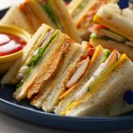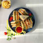 -Three bread slices per tayyar sauce,tandoori chicken pieces aur cheese slice dal ker flip ker lein phir tayyar sauce,salad patta,pyaz,tamatar,kheera aur cooked anda dal dein aur bread slice ko flip ker ka sandwich bana lein.