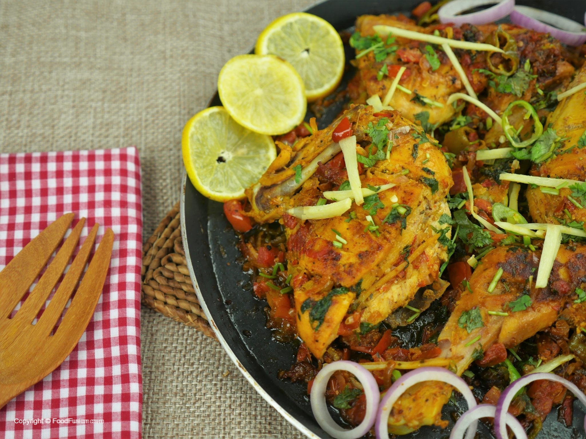 Heat oil on tawa, add chicken with marination and fry until chicken is half done, set aside.