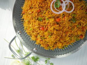 -Garnish tawa veg pulao with onion rings & serve with zucchini dahi.
