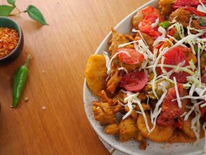 -In a serving platter, add fried pakoray, fried tomato & green chilli slices, pickle, garnish with cabbage & serve!
