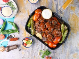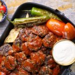 Add naan or pita bread pieces & toss,add prepared tomato sauce,prepared meatballs,grilled vegetables,tomato sauce,melted butter & serve with greek yogurt!