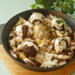 On serving dish,add potato fries,cooked meat balls,garlic yogurt,pour heated meatballs oil,fresh coriander & serve!
