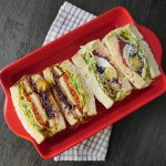 On cling film,place bread slices and apply mayo mustard spread,ice berg,cheese slice,carrots mixture, fried chicken pieces,Bbq sauce,cucumber slices,purple cabbage mixture,tomato slices,fried egg and top with another slice,wrap in cling film then cut into two pieces & serve!