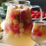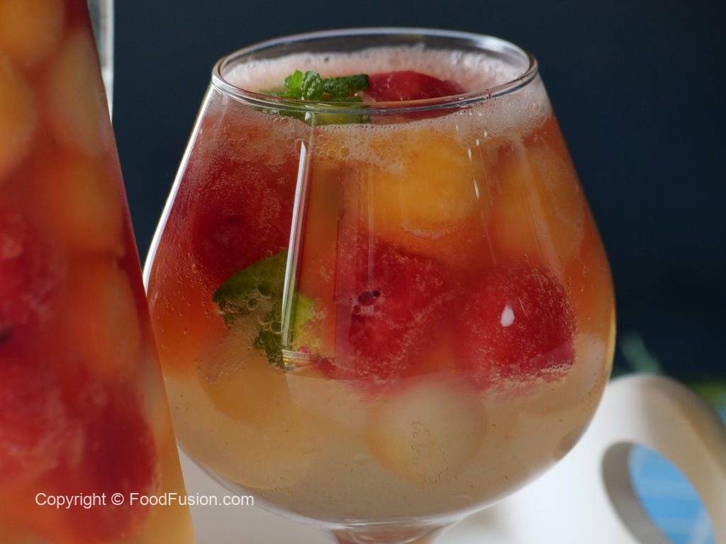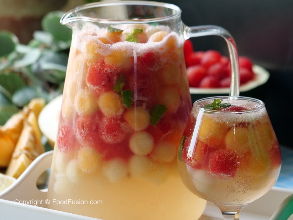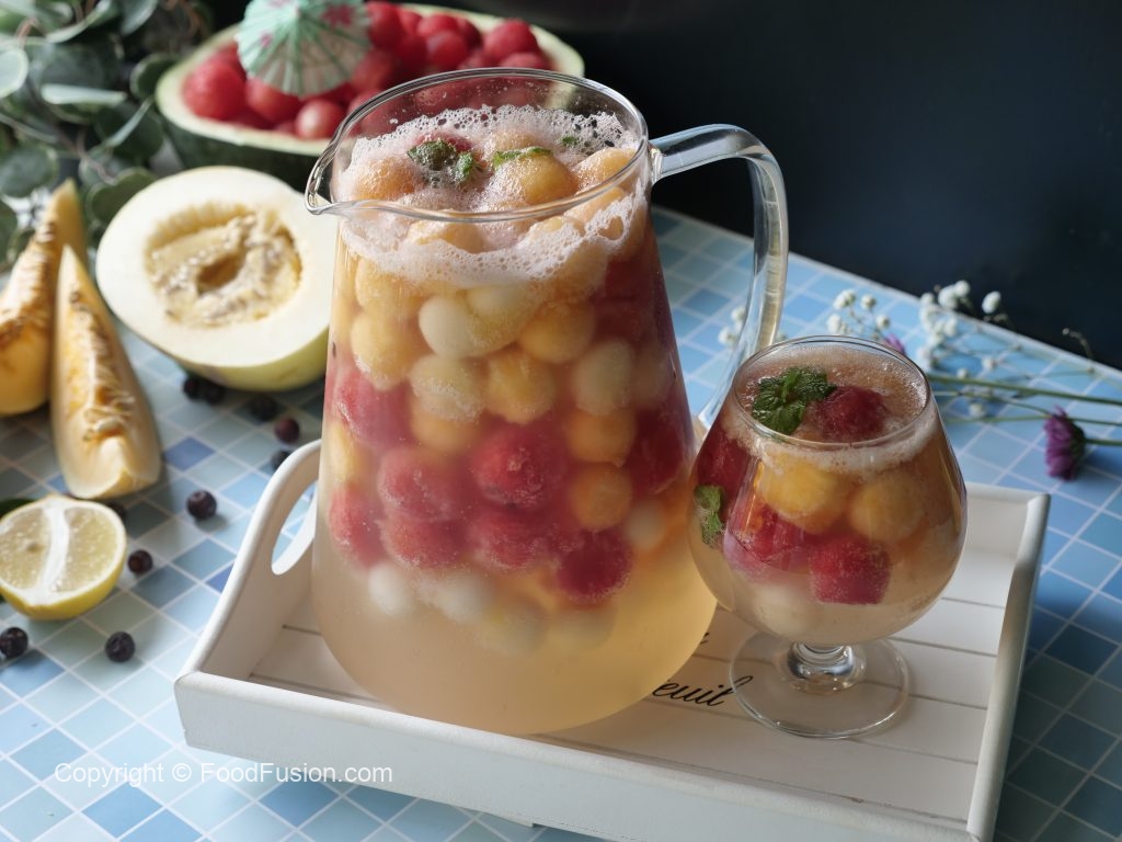 In a pitcher,add melon balls,watermelon balls,honeydew melon balls,prepared juice,7up,mint leaves,stir & serve!