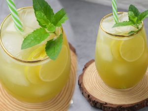 Blender jug mein crushed ice,pineapple juice,pani,lemon juice,namak,kali mirch powder aur cheeni dal ker ache tarhan blend ker lein & side per rakh dein.