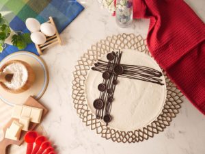 Add prepared cream frosting on cheesecake & use an offset spatula to smooth down the top then remove the rim.
