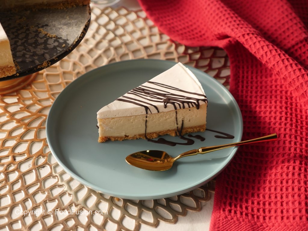 Cheesecake ko melted dark chocolate aur chocolate button sa decorate ker len desired slices mein cut ker ka serve karein!