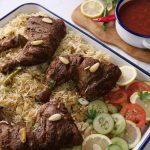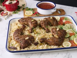 -Garnish with almonds,fresh coriander & serve chicken mandi with mandi rice & sauce!