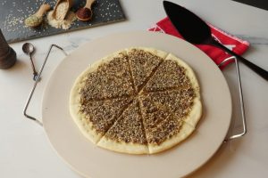 In bowl,add coarsely grounded sesame seeds,sumac powder,dried thyme,dried oregano,salt,black pepper powder and mix well.