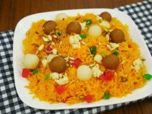 Zarda is ready, add gulab jamun and chum chum for garnishing.